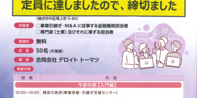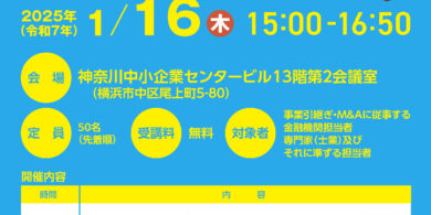 専門家・支援者向け事業承継・M&Aセミナー神奈川県内においては、親族内承継のみならず、第三者承継や従業員・役員承継も活発化してきており、これに伴い承継支援の在り方も変化しつつあります。そこで今回は、事業承継やM&Aを進めて行く上での課題や問題点並びにM&Aにおける重要なポイントを知っていただくと同時に、専門業者との顔の見える関係性を構築することを目的としたセミナーを開催します。セミナー詳細 開催日付 2025年(令和7年)1月16日(木) 開催時間 15:00~16:50 開催会場 神奈川中小企業センタービル13階第2会議室(横浜市中区尾上町5-80) 定員 50名(先着順) 受講料 無料 対象者 事業引継ぎ・M&Aに従事する金融機関担当者専門家(士業)およびそれに準ずる担当者 テーマ 中小M&Aで頻発するトラブルとその予防・対応策 講師 株式会社オンデック(東証グロース市場)代表取締役社長 久保 良介 氏 カリキュラム時間内容…